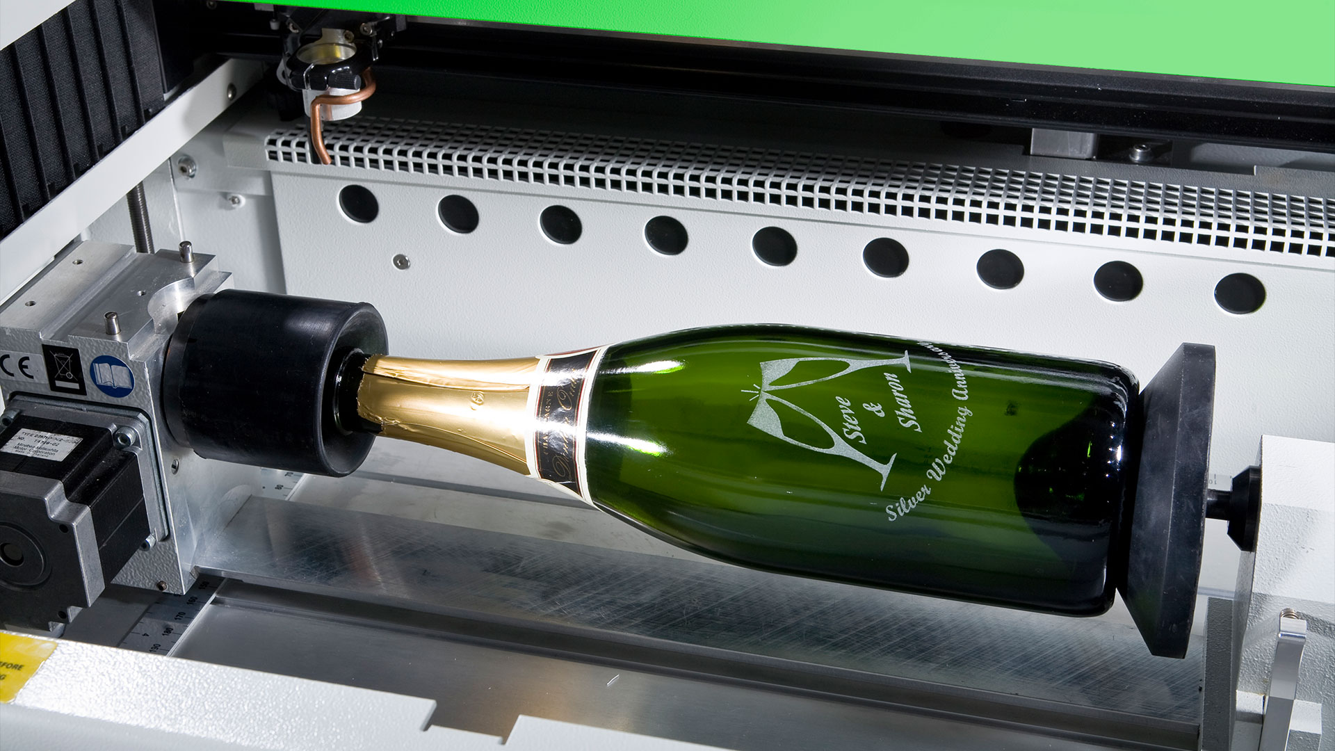 El grabado puede realizarse tanto en la superficie de la botella como en sus accesorios (corchos, etiquetas, cubetas). Se pueden agregar logotipos, nombres, fechas especiales, mensajes personalizados y más.