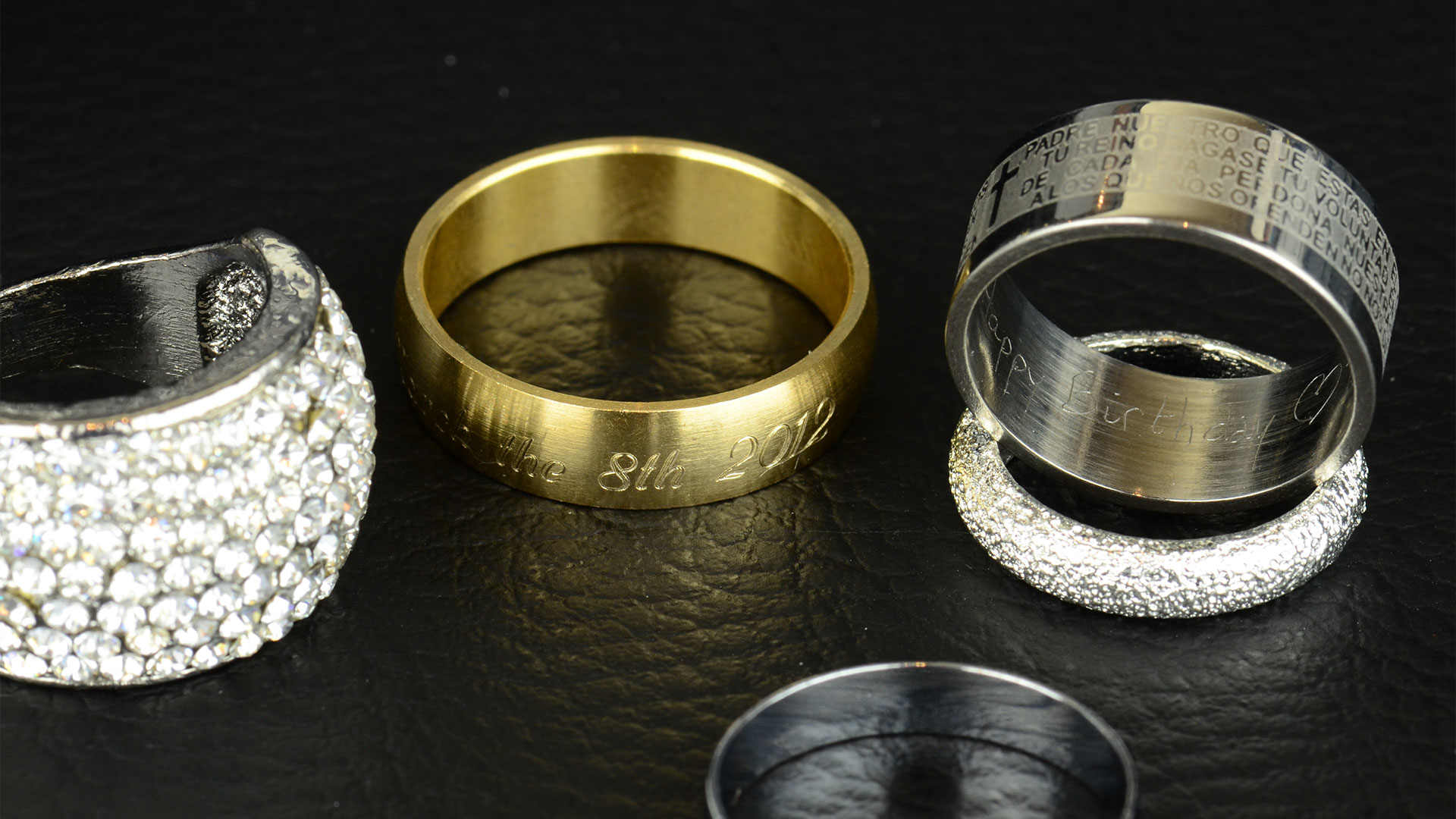 Puedes grabar anillos, alianzas, pulseras rígidas o brazaletes en una variedad de metales, incluyendo oro, plata y acero.